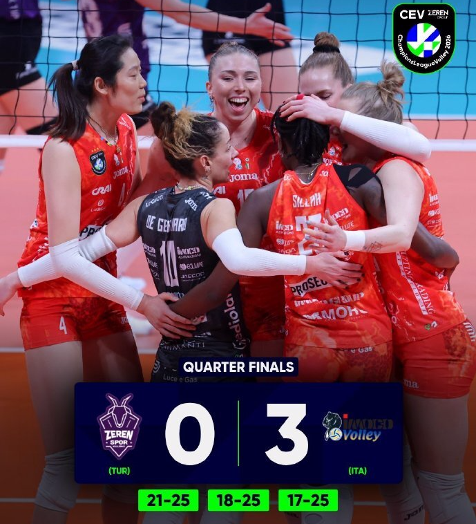 在北京时间3月12日结束的女排欧冠1/4决赛首回合一场焦点战中,意甲霸主科内利亚诺在客场3-0横扫土超球队泽仁体育,3局比分为25-21、25-18、25-17。